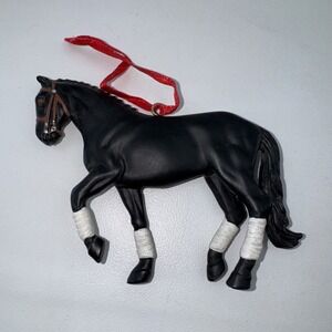The product is a set of two vintage Midwest of Cannon Falls black resin dressage horse ornaments, perfect for the fall season. These small ornaments feature a horse subject and are part of a collection of holiday and seasonal decor. With their original vintage design and black color, they would make a charming addition to any Christmas tree or holiday display.