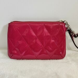 Coach Raspberry Pink Diamond Quilted Patent Leather Wallet Clutch Wristlet. Logo on front of bag, top zip closure, solid silver toned hardware, swivel hook, tan interior lining with 2 card slot pockets. Approximately measures 4.25" x 6.5". Some minor cracks under strap, not noticeable at all. Otherwise, it's in great condition!
