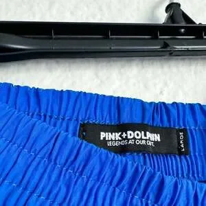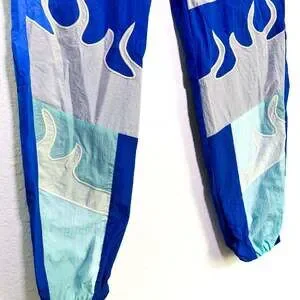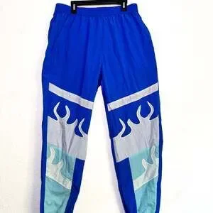 Pink Dolphin The Waveflare Track Pants in a vibrant blue, size Large. These eye-catching track pants feature a distinctive waveflare design in light blue and grey accents, making them a standout piece for streetwear or casual wear. The elastic waistband ensures a comfortable fit. Excellent pre-owned condition, with no visible flaws or signs of wear.