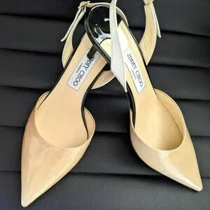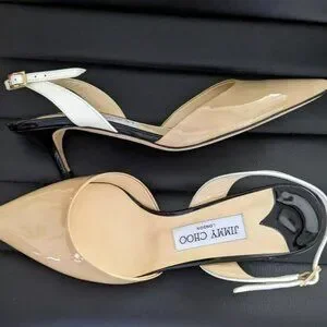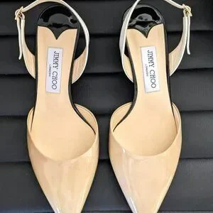 Jimmy Choo Women Patent Leather Pointed Colorblock Slingbacks Beige/Blk