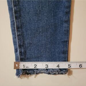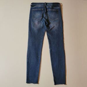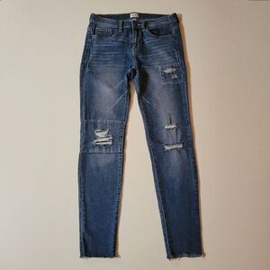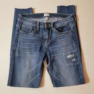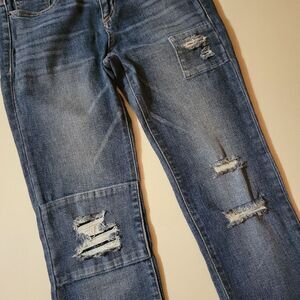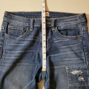 Medium wash skinny jeans with distressing/patches on the front of the legs have a medium-rise and stretch for a comfortable fit. These fun and trendy denim jeans are perfect for casual Fridays at the office or a night out with friends. Excellent condition.