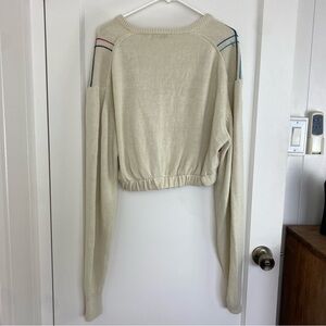This sweater is everything! ❤️ Extra long sleeves, a v neck, and cropped length with elasticized hem. Embroidered country club logo. Multicolor plaid stripes (fuchsia, blue, turquoise)
