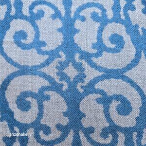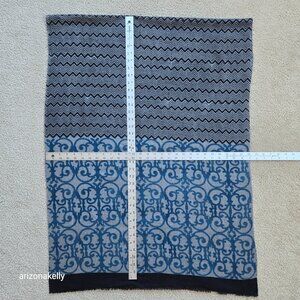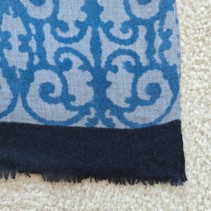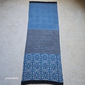 No flaws on this wool scarf in blue, grey, and black. No pulls, runs, holes, pet hair, or odor.