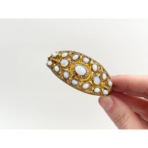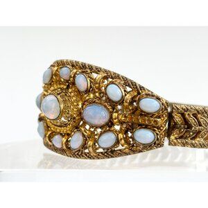 Awesome gold toned vintage cuff bracelet accented with many faux opal stones. Cuff style. The stones are all bezel set. The gold is textured along the exterior lining. Despite flaws, it's such an awesome bracelet. I would still rock this!!