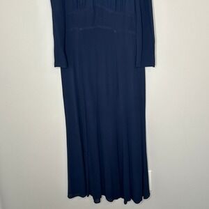 Keywords: Reformation dress, navy midi dress, long sleeve dress, keyhole neckline, flowy dress, elegant dress, sophisticated dress, wedding guest dress, evening dress, cocktail dress, party dress, viscose dress, made in usa