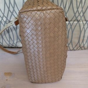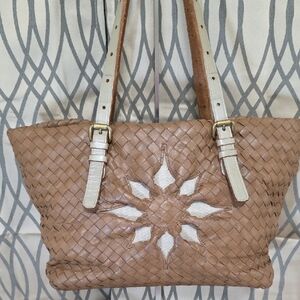 Bottega Veneta Vintage Brown Woven Tote with Cream Accents Straps