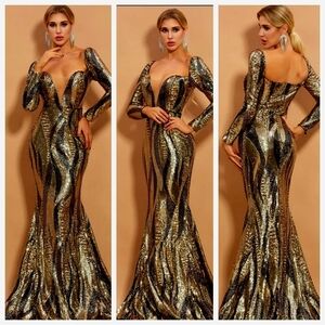 Gold and Bronze, Long Sleeve, Sweetheart Neckline, Contrast Sequined and Contrast Mesh Mermaid Maxi Formal Gown for Special Events