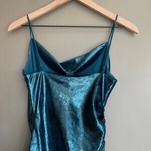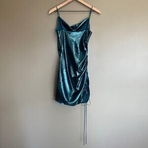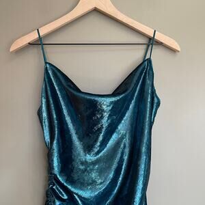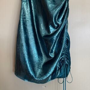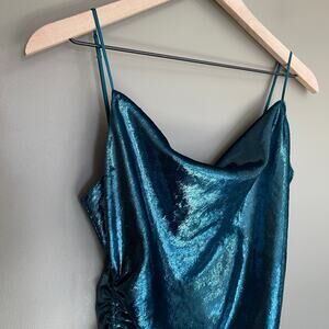 CINQ A SEPT Shiny Astrid Dress in Teal Topaz, Size 2, Blue Green Teal Color, Metallic Textured Material, Sleeveless, Spaghetti Straps, Cowl Neck, Bodycon, Ruched Side Detail, Self Tie at Hem, Mini Length, In like new condition with no flaws or signs of wear.