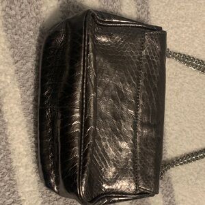 Elevate your style with this chic metallic silver shoulder bag. Perfect for any occasion, it features a sleek design and a sturdy chain strap. Magnetic closure.