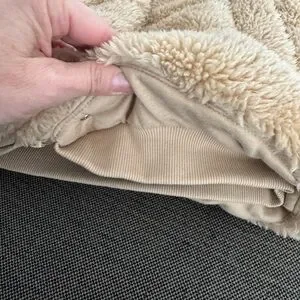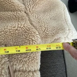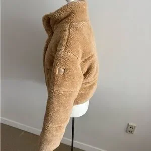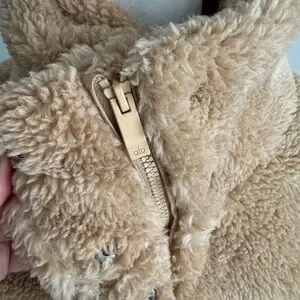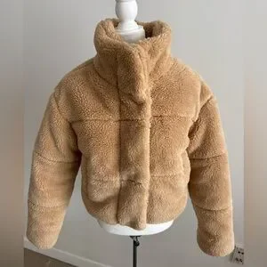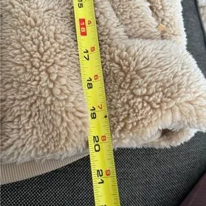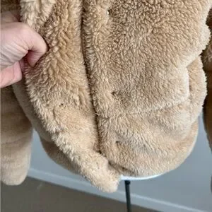 Great condition. Teddy bear shearling bomber style jacket. No hood. Snaps down front. Ribbed at cuffs and waist. Worn maybe 2x