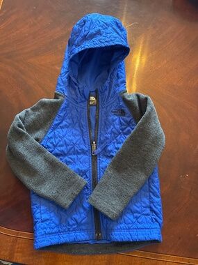 Toddler 3T size Northface blue and charcoal colored coat/jacket. This is a lightweight coat in good condition. It has two pockets, a hood, and the charcoal colored sleeves are soft knit.
