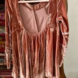 Features: Soft velvet fabrication, scoop neckline, raised seam detail, open-back with elasticated detailing, button closures at sleeves