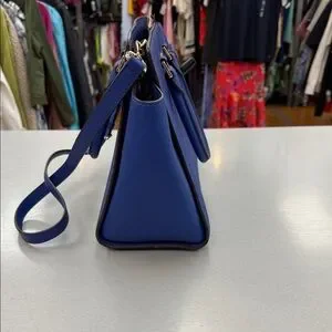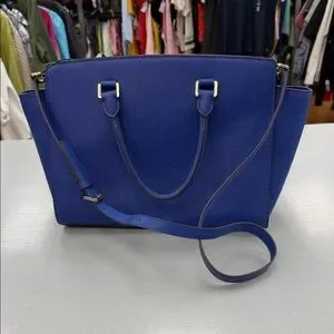 Chic Michael Kors satchel in vibrant blue. Sleek design with gold-tone accents. Perfect for everyday elegance.