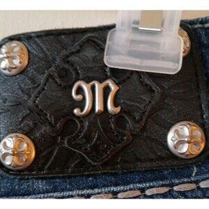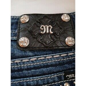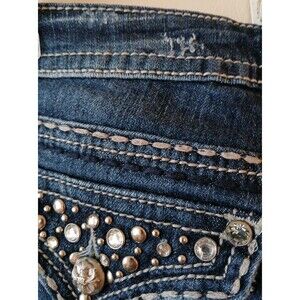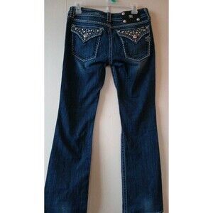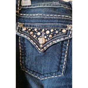 These are Miss Me bootcut jeans for women in size 28 with a dark wash and a mid-rise fit. They feature rhinestone accents on the pockets and have a zip and button closure. Made of cotton, these jeans have a 28-inch waist and a 33-inch inseam. The style is bootcut with pockets. Worn 1x. As with any used clothing expect signs of wear and tear.