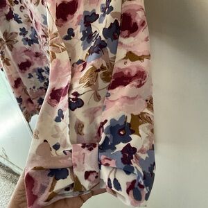 Beautiful and feminine floral blouse by Lauren Conrad. Features a soft pink, blue, and burgundy flower print, long sleeves with a cute bow-tie detail, and a relaxed, flowy fit. Perfect for work, brunch, or everyday wear.