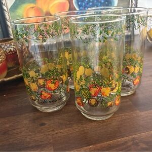 Set of glass tumblers with vibrant fruit pattern. Features oranges, greens, and yellows.