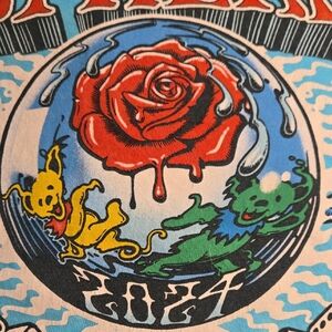 Vibrant tie-dye design. Features Grateful Dead graphic. Short sleeve style. Perfect for fans.