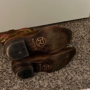 Step out in style with these beautifully embroidered floral cowboy boots. The rich brown color complements the intricate floral design, making these boots a must-have for your wardrobe. Only worn indoors once.