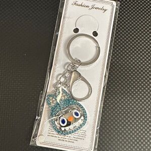 Charming keychain. Features glitter accents. Ideal for bags or keys.