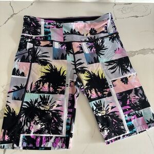 Stylish Y2K biker shorts with a vibrant tropical print. Features a mix of colors for a bold look.