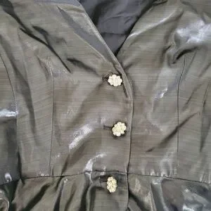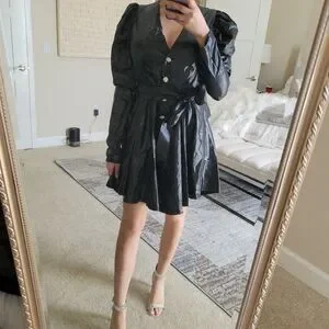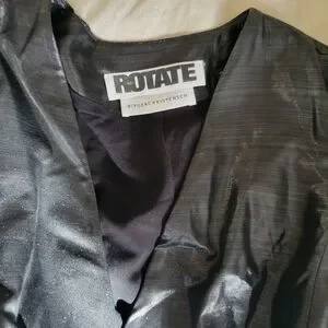 tags- metallic, chrome, jeweled buttons, puff sleeve, high low skirt, belted waist, event, nye, birthday, holiday