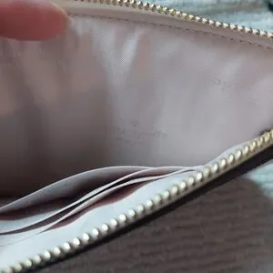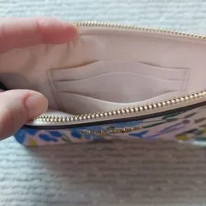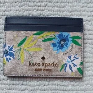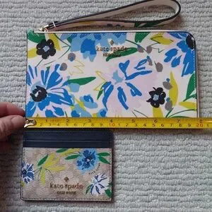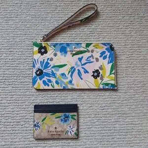 You get both! Kate Spade Lucy Flower Medium L-zip Wristlet and Floral Small Slim Card Holder. Wristlet will hold a phone and has 3 card slots on the inside with champagne colored kate spade logo interior and an exterior back slip pocket. Wristlet has gold hardware zip closure, and the handle is even in floral print! The card holder has 2 exterior credit card slots on the front and back for a total of 4 and a middle compartment lined with bronze colored kate spade logo fabric. The perfect duo for when you want to travel light but still have the essentials! Wristlet alone retails for $139.