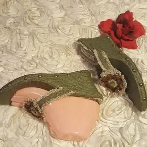 You are viewing a new pair of Wild Rose wedge sandals/ shoes. Bead embellishment on front, frayed edges and studs along bottom. New without tags or box. Come from a smoke-free home. Please make sure to view all pictures for details. Box not included.