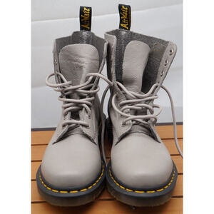 Light gray boots with classic lace-up design. Features signature yellow stitching. Durable leather construction.