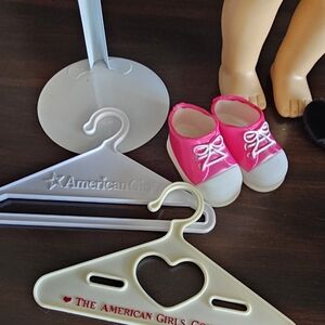 2013 doll, hair in great shape. has a small dark spot on arm as shown in the photos. the outfits are not American Girl brandexcept the PJs those are vintage IVY American Girl Brand includes American Girl hangers.