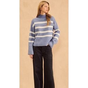 Made from a soft knit fabric and features a striped design, mock neck, ribbed details and a relaxed fit.
