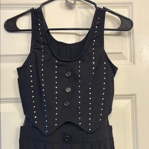 Weissman adult small jumpsuit dance costume. Stylish black jumpsuit with rhinestone stud accents. Matching Rhinestone elastic hairpiece included.