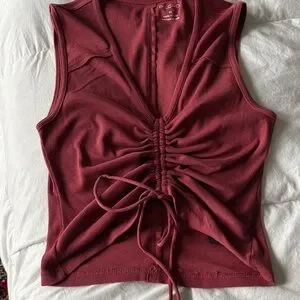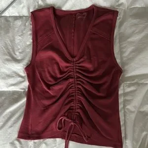 Stylish burgundy tank with ruched front. Sleeveless design for versatile wear. Like new.