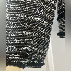Sophisticated black and white tweed lined blazer by Talbots with Three Button black enclosure. Same buttons are used for pocket enclosure. Size 12. Features a timeless design with elegant detailing that includes a black fringe trim. Ideal for professional or casual wear. Excellent preowned condition. Length top of shoulder to bottom is 23”.