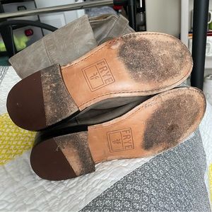 This is a pair of Frye boots in size 7, color "rugged grey". There is some orange-color discoloration on one of the boots, as shown in the pictures, and marking on the soles.