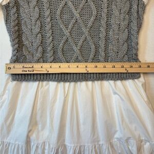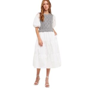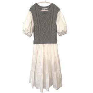 Mixed Media, Twofer, Preppy, Academia, Cottagecore, Hygge, Modest, Minimalist, Layered Look, Romantic, Feminine, Fall Staple, Winter Chic, Scandi Style, English Factory dress, cable knit vest dress, tiered midi dress, puff sleeve dress, sweater vest combo, mixed media midi, gray and white dress, English Factory sweater dress, tiered ruffle dress, poplin puff sleeve, layering dress, designer midi dress