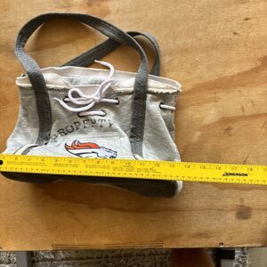 Pre-owned Little Earth Denver Broncos purse bag from the Pro-FAN-ity collection, in gray and black. This stylish bag is perfect for fans of the Denver Broncos, featuring the team's logo and colors. It offers ample space for your essentials, making it both fashionable and functional.