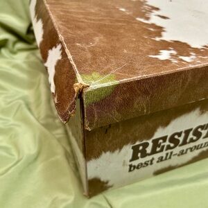 This vintage hat is a self-conforming cowboy hat by Resistol. Circa 1970’s or 80s. 3 x beaver felt with beige cord string around crown. Made in Texas, USA. Color Beige. Hat Size 7 1/8. This hat shows small signs of wear, no flea bites, or holes. Hat is in good vintage condition. Box is included and does show signs of wear and tear, please pictures.