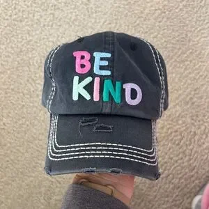 Stylish black cap with colorful 'Be Kind' embroidery. Features pink, blue, green, and purple letters. Perfect for casual wear. Never worn.