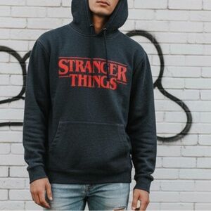 Authentic Stranger Things grey hoodie with iconic red logo, size M. Perfect for fans and casual wear. This comfortable pullover is ideal for a Y2K aesthetic or everyday comfort. Excellent condition.