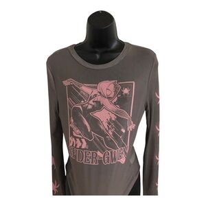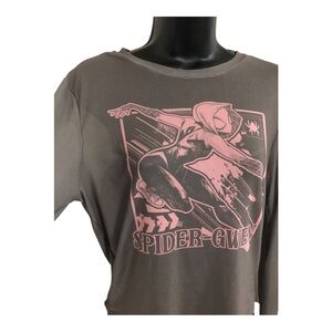 Marvel’s Spiderman SpiderGwen olive green brown pink graphic print sheer mesh long sleeve top size large new