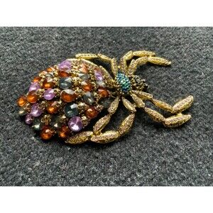 Spider Rhinestone LARGE Brooch, Rhinestones throughout. Gold tone legs with lilac stone. Body orange, lilac, dark stone, black eyes. Brooch / Pendant. Measures 4" in length.