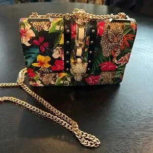 An absolutely beautiful, bag for any and every occasion. Brilliant colors with a bit of crystals, gold trim and chain. 8"W x 5" H: 22" chain. Never used. Pristine condition.