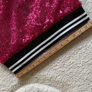 New-never worn-Bright Fuchsia pink sequin bomber jacket with black and white striped cuffs and hem- zipper-no pickets-bought 2 for the Grands but one wants black!?!? no size on label-see measurements