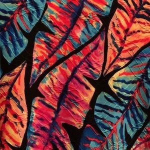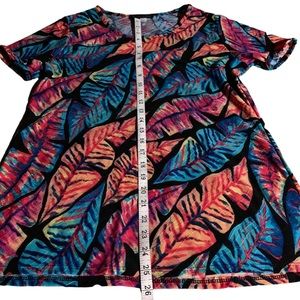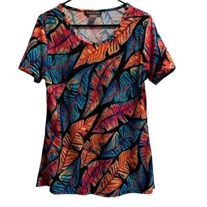 Nothing boring about this top. Fun, colorful pull over, short sleeve t-shirt with bright leaves in many colors. Black background with blues, reds, oranges, yellows and more. Fabric has a little raised texture around the leaves. Goes great with black pants or jeans. Gently used and well taken care of.