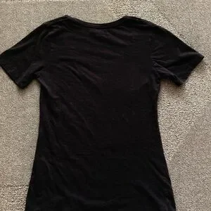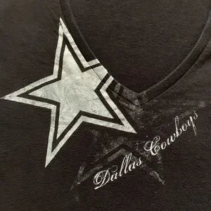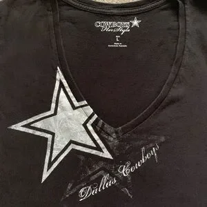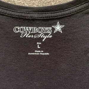 Dallas Cowboys “Her Style” black short sleeve v-neck tee shirt. Has a the star logo and name in cursive writing in silver on front.