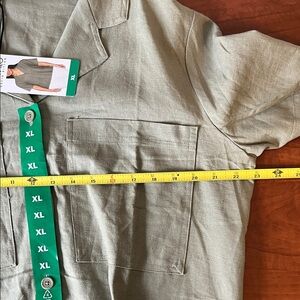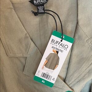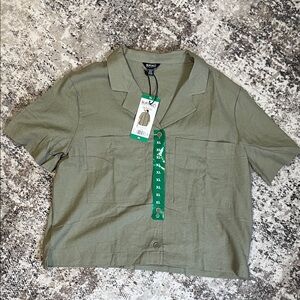 Buffalo David Bitton. Features a sleek collar and button closure. Buffalo Women's Linen Blend Short Sleeve Button Front Top in a light olive color and XL size.