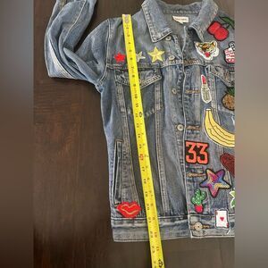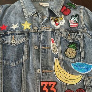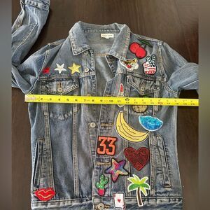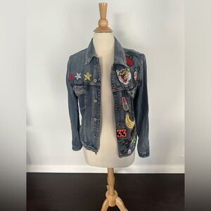 Sunset + Spring Patched Denim Jacket-Womens Size Small with various colorful sequent patches in great condition. The inside tag is lose on one side but doesn't affect the wear.