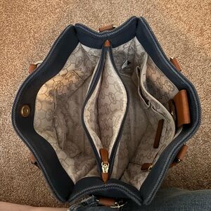 Preloved vintage Michael Kors women's bag features a classic navy and brown color combination. Perfect for any occasion, it offers both elegance and functionality. Tons of pockets and two sides separated by zipped section. Lots of life left!!