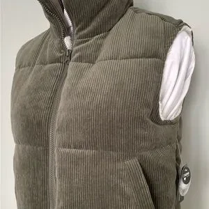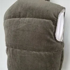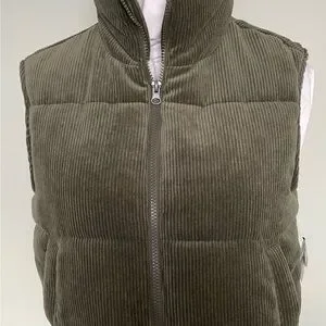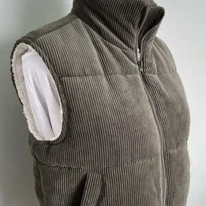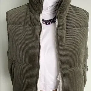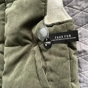 Cozy olive vest with faux fur lining. Features corduroy texture and button details.
