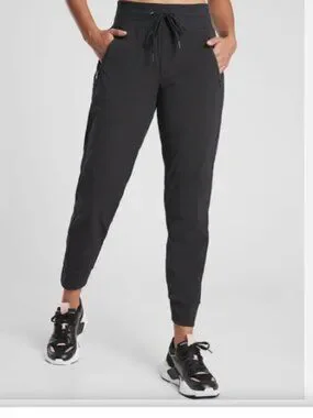 The Athleta Trekkie Jogger features pull on draw string waist , zip front pockets , back wallet/phone pocket , tapered leg. Slacks are in like new condition and measure 32 in waist, 28 in leg inseam